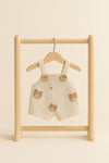 Labubu Outfit - Beige tuinbroekje met teddybeerprint en knoopdetail