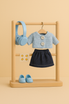 Labubu Outfit - blauw vest met knopen + jeans short + blauwe sneakers + blauwe hoofdtelefoon