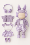 Labubu Outfit - lila gebreid vest + top + geruite rok + paarse schoenen + hoofdtelefoon
